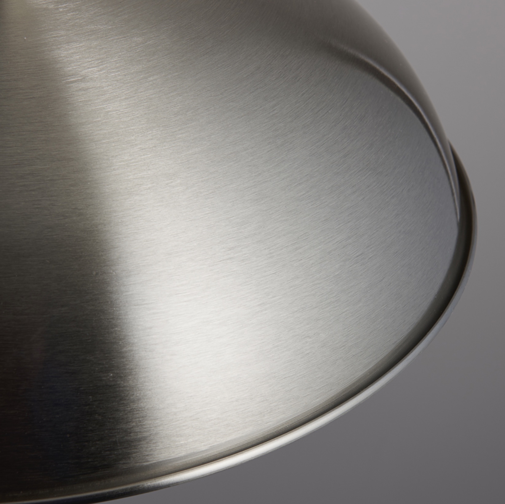 A Rise & Fall Industrial Pendant with a satin nickel finish. The height of the light can be adjusted after installation from 92 cm minimum and has a maximum height of 198 cm. For rooms with higher ceilings and for use in dining areas.