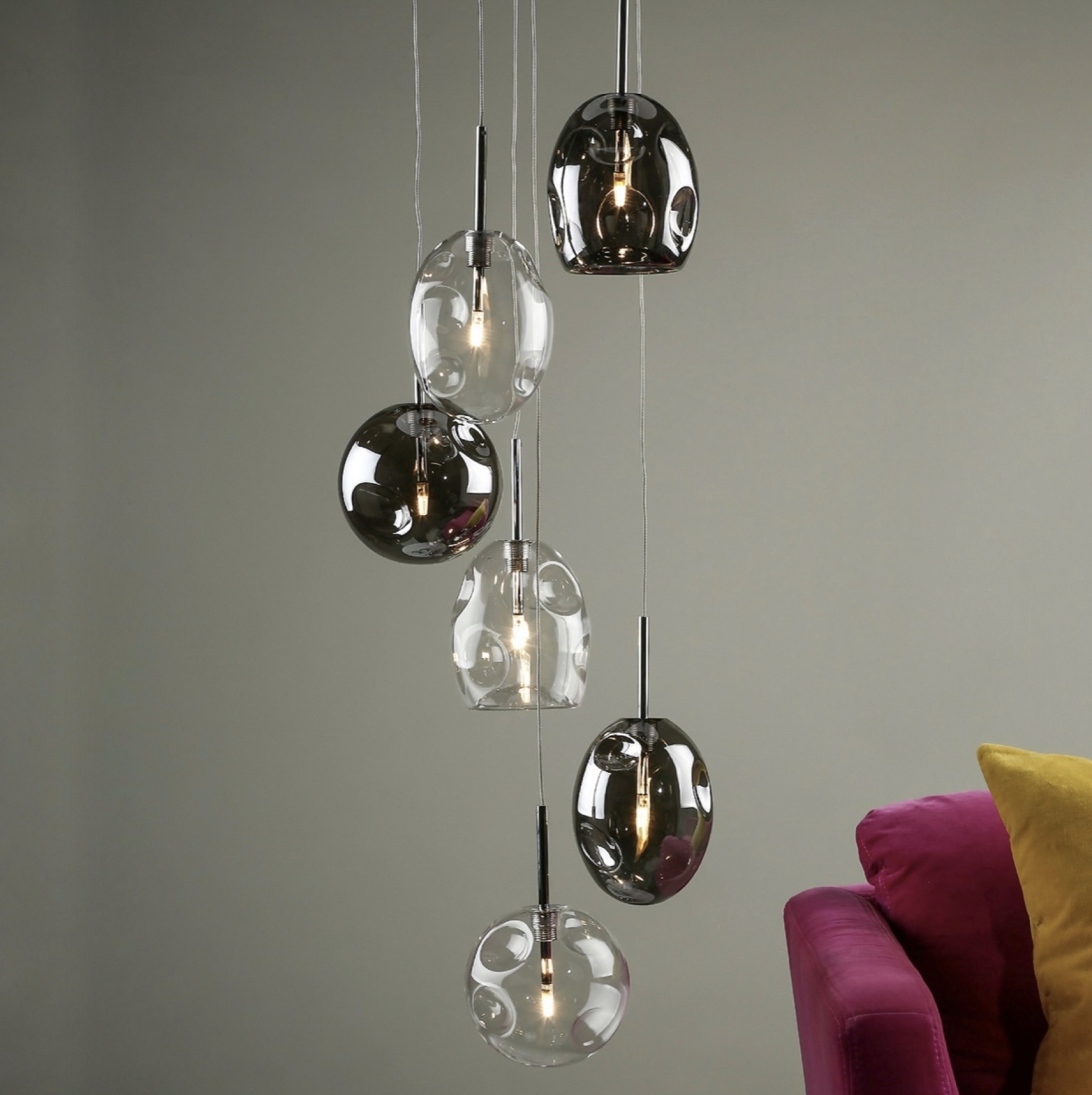 QUINN - six organically shaped blown glass spheres are suspended in a cluster. Each glass piece is a unique shape that alternates between clear and lightly smoked glass. Lit with G4 Halogen lamps or LED equivalents, this make a stunning statement piece is suitable for feature staircases, above tables or wherever height allows.