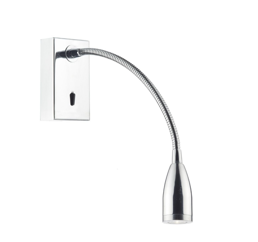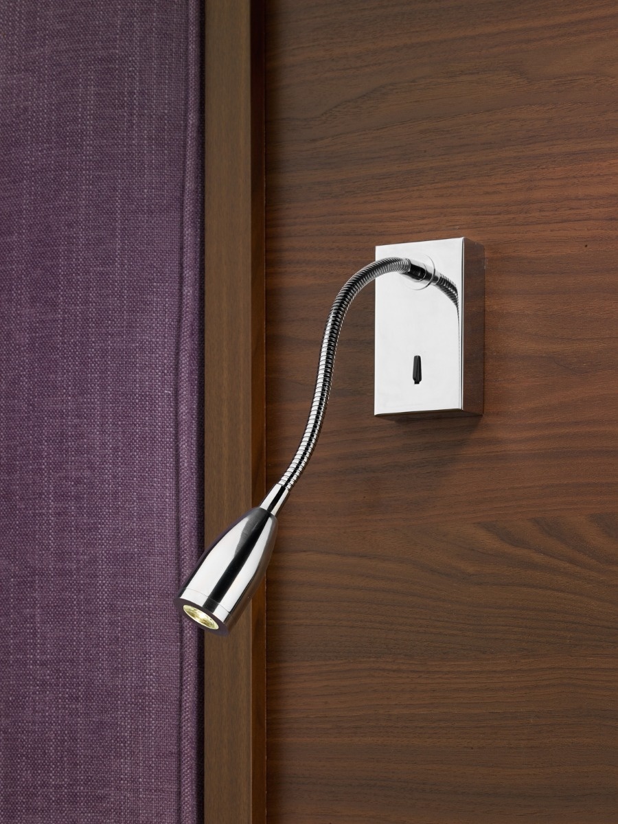 The contemporary Radley - Hotel - Gooseneck LED Reading Wall Light - Polished Chomel is a modern bedside wall light with an adjustable gooseneck LED reading light; perfect for both domestic and hospitality spaces.
