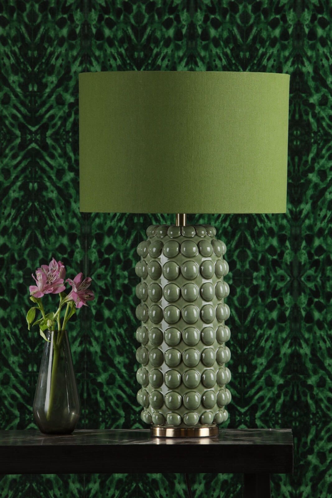 This is a beautiful contemporary table lamp - the olive green ceramic glaze is the on-trend colour for the season, more so when finishes with the must-have metallic satin brass. The lozenge shape with the raised large bobbles makes it beautifully tactile. The table lamp is complete with a deep olive shade and an inline on/off switch in the black fabric power cable.
