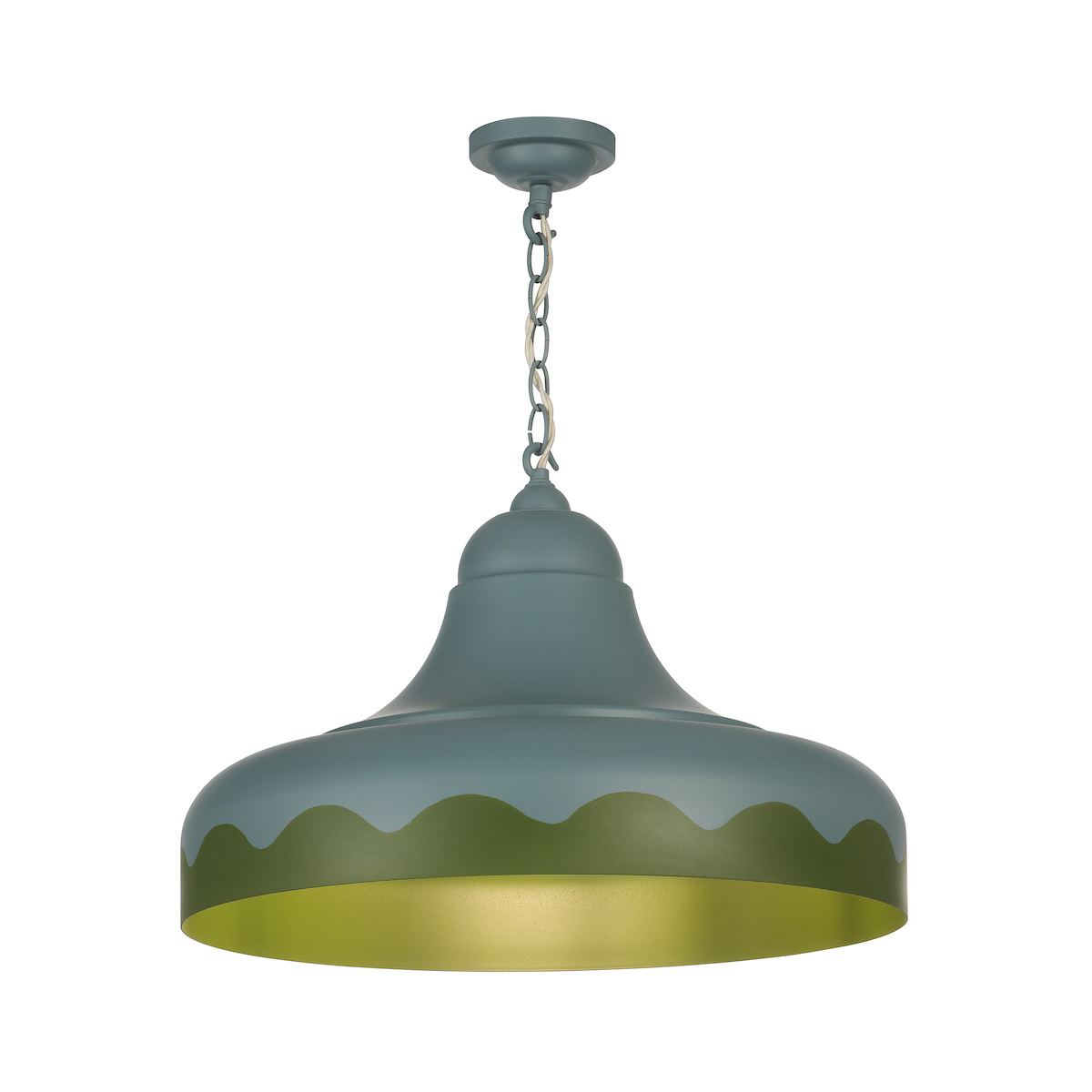 The cool tone of the Etruria outer pendant blue shade is perfectly combined with the green Jewel Beetle scalloped edge and inner.
