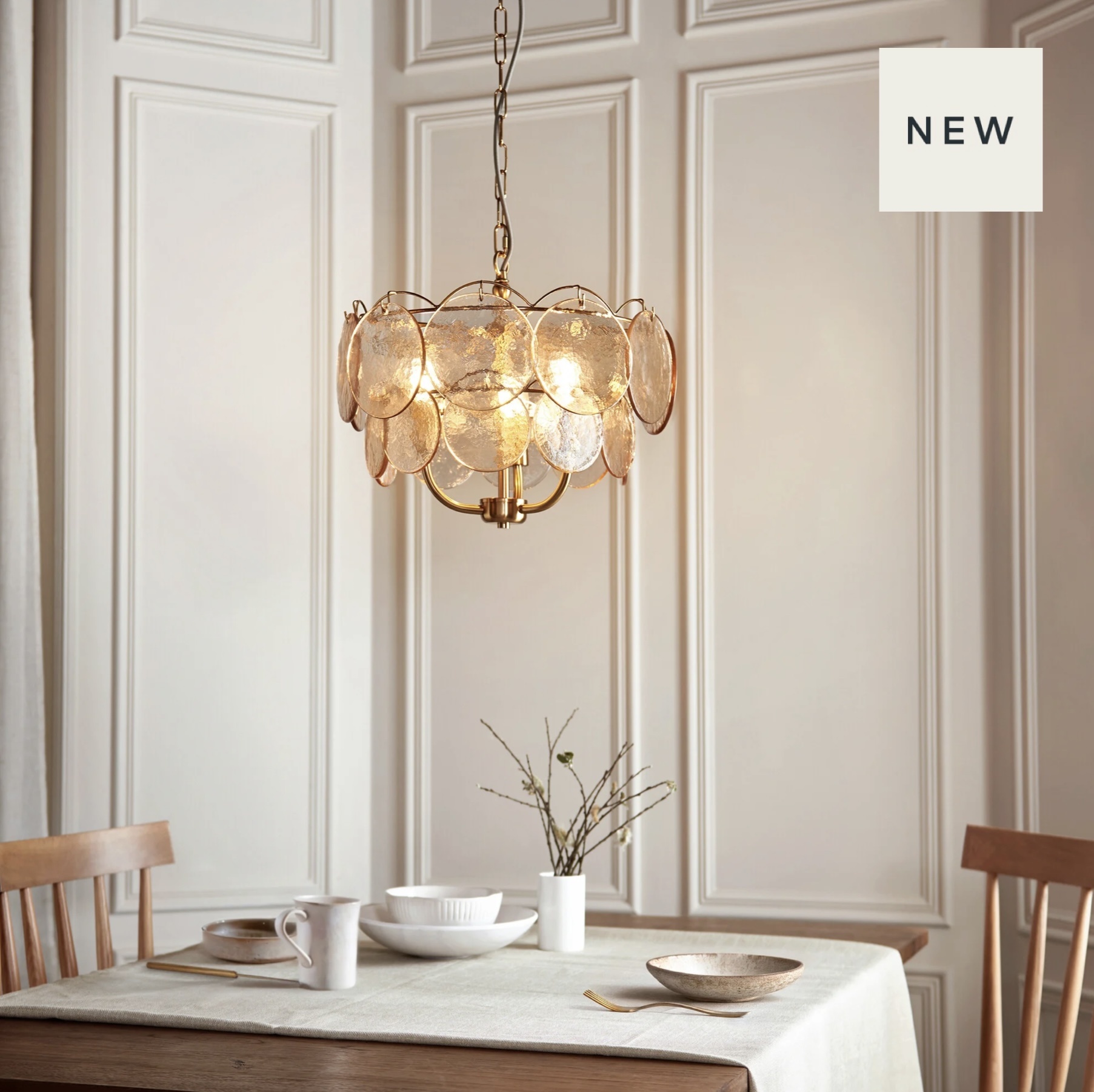 The Tavira chandelier brings a refined interplay of light, texture and tone. Handmade champagne-tinted glass discs scatter light in a warm, dappled glow, while the brushed aged brass frame adds subtle sophistication and depth.