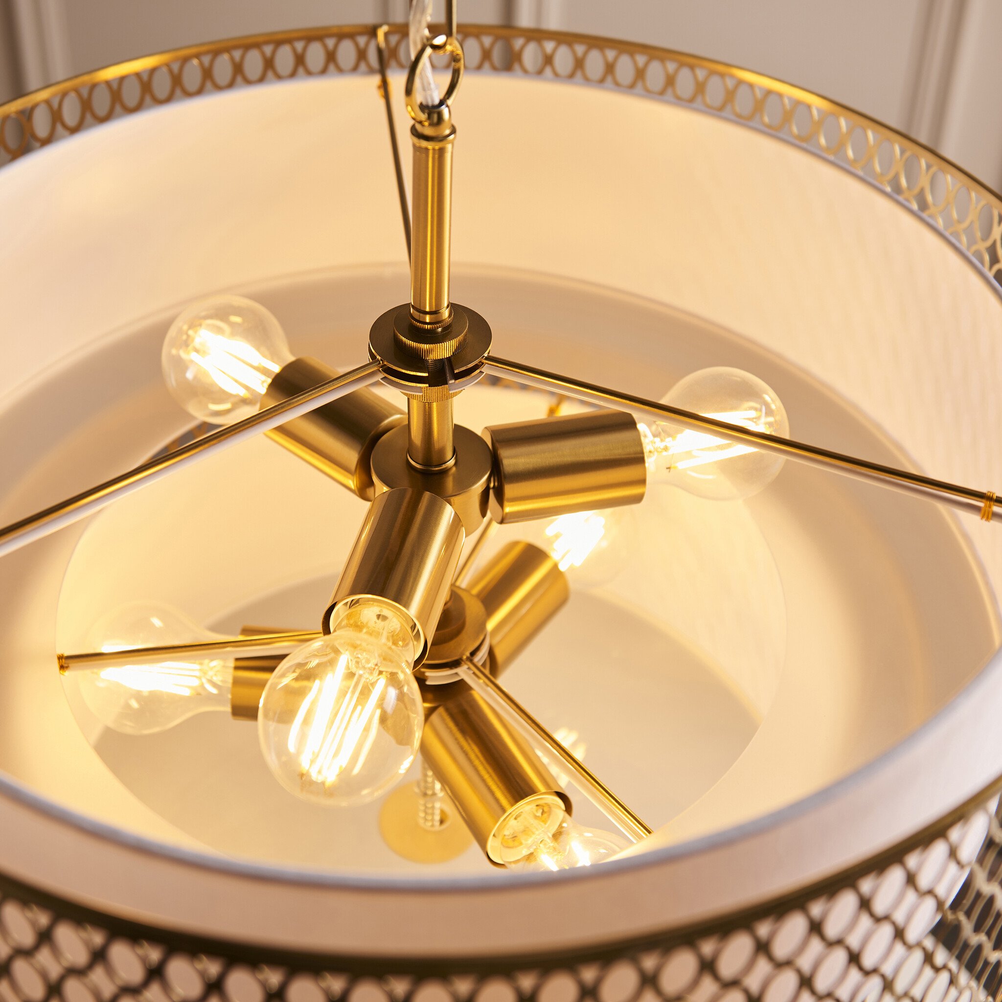 Striking a balance between modern elegance and soft ambient lighting, this six-light tiered pendant features a decorative fretwork metal outer frame surrounding a white fabric inner shade. The frosted glass diffuser below ensures a gentle, even glow, perfect for creating atmosphere in living or dining spaces. Suspended from an adjustable chain, its sculptural layered design makes a stylish statement while providing functional illumination.