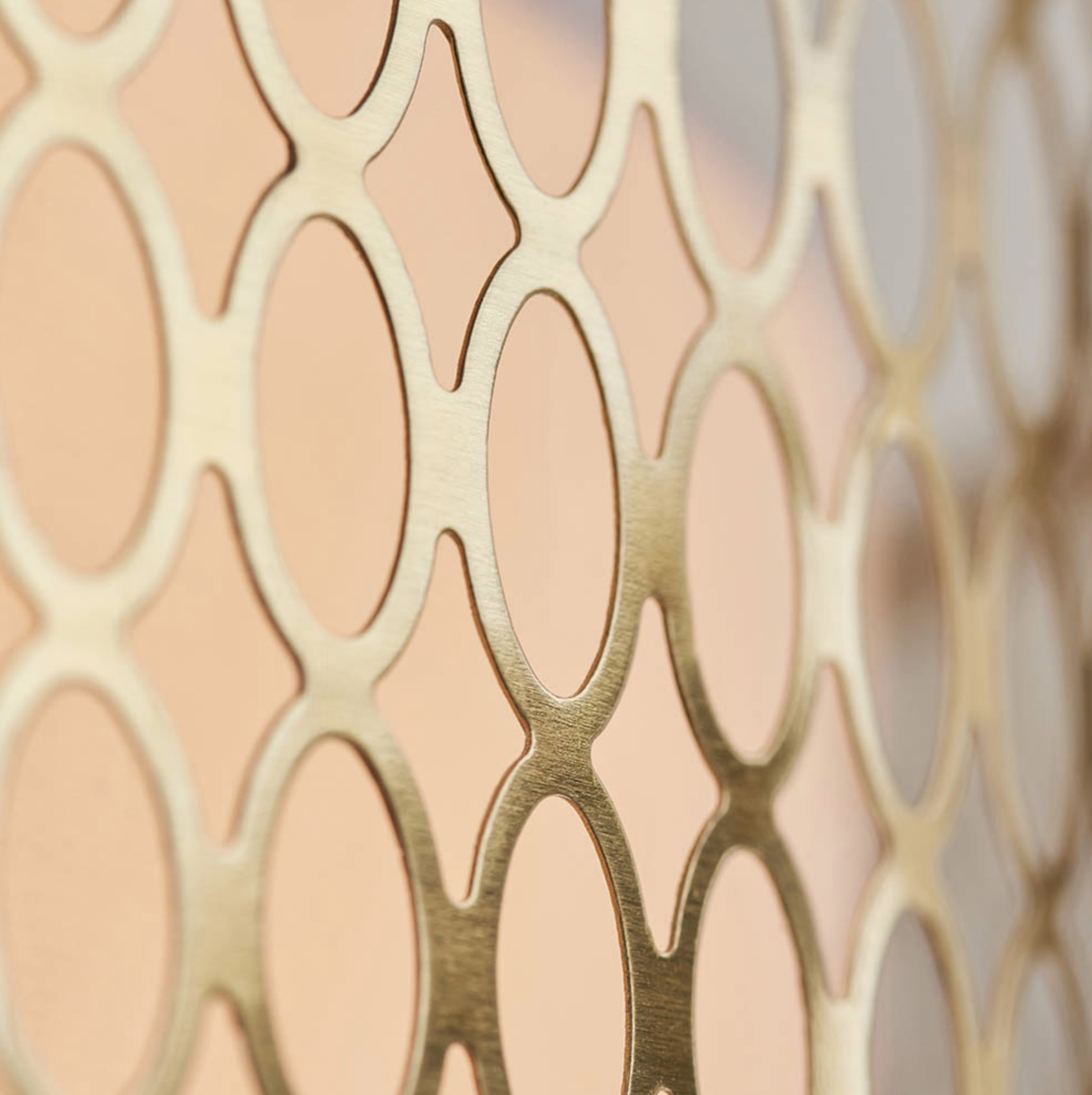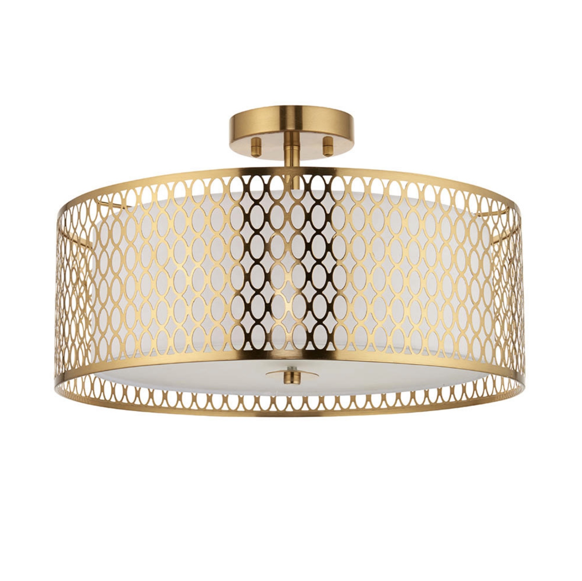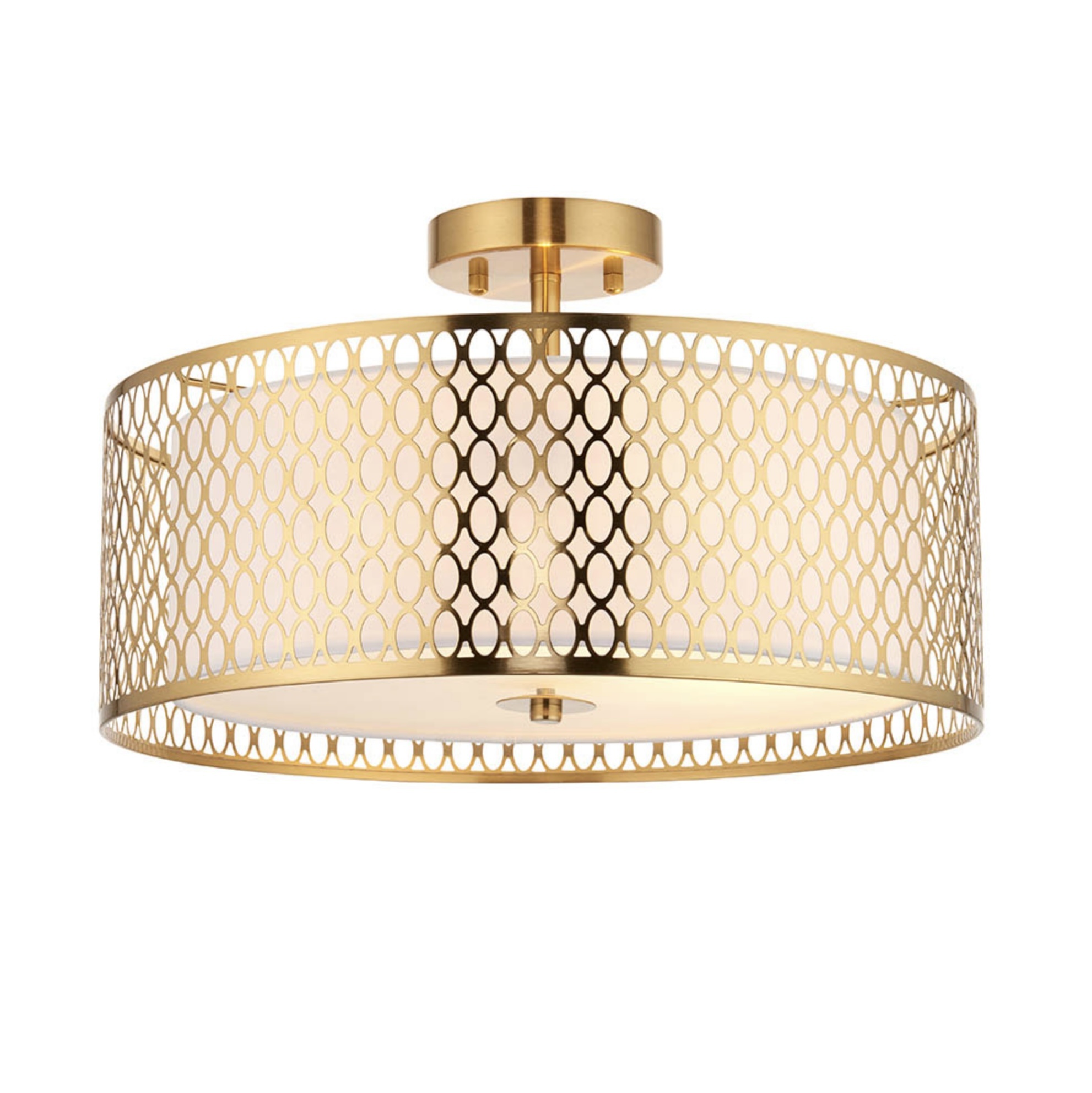 The Tessa is a modern semi flush ceiling light featuring an elegant oval fretwork metal outer, finished in a warm gold plating effect and an inner white fabric shade - creating a bright yet diffused light for the centre of bedrooms and living rooms. No glare - the Tessa has a frosted glass diffuser covering the bulbs.