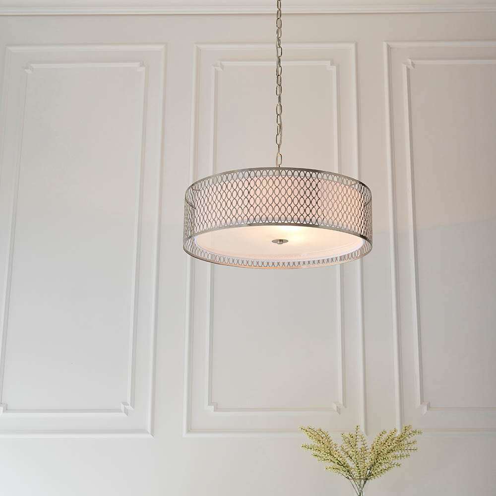 A classic circular light with a modern geometric fretwork metal outer and an inner white fabric shade for lovely light diffusion. As well as being dimmable this product has a height adjustable chain and flex so it can fit to any space.