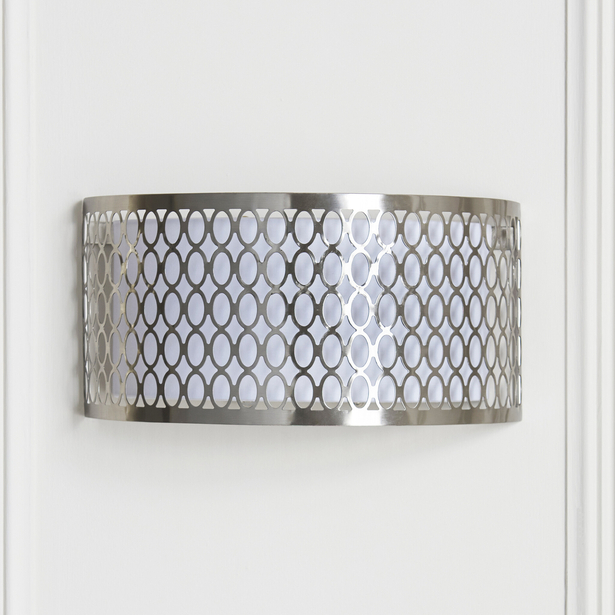 The perfect modern wall light for living rooms, bedroom and hallways. Featuring an elegant geometric metal fretwork outer, plated in satin nickel and an inner white fabric shade for lovely light diffusion, complete with top and bottom frosted glass diffusers to complete the look. Matching items available.