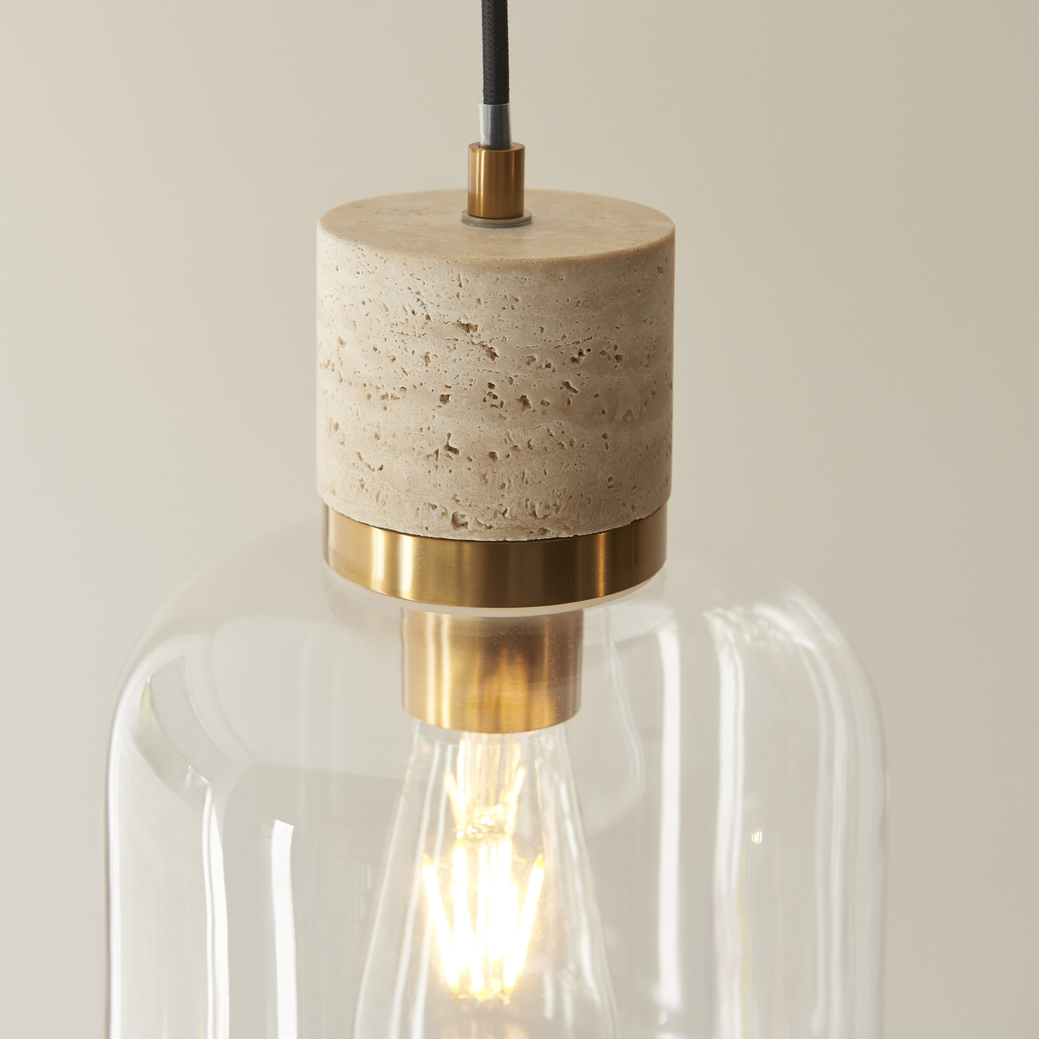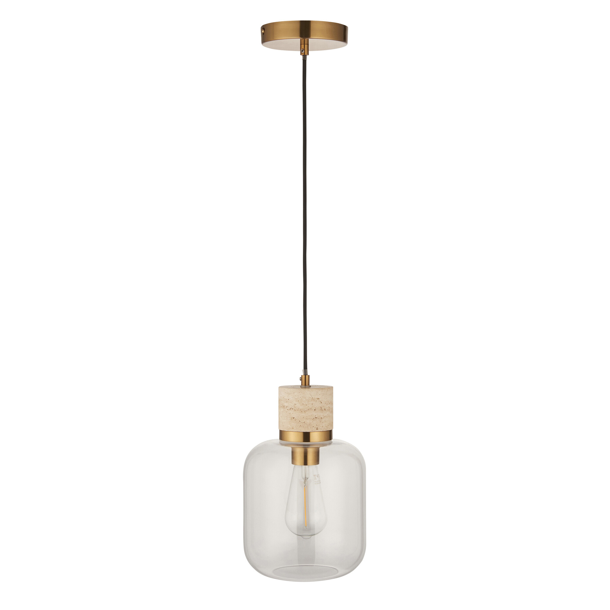 Elevate your interiors with this effortlessly stylish single pendant light, combining natural textures with sleek metallic accents. A natural travertine stone top pairs beautifully with a warm brass collar, suspending a softly rounded clear glass shade that showcases the bulb within. Hung from a matching brass ceiling rose with a sleek black fabric flex, this pendant makes a striking feature over kitchen islands, dining tables, or in contemporary living spaces. Understated yet elegant, it offers a perfect balance of modern refinement and organic warmth.