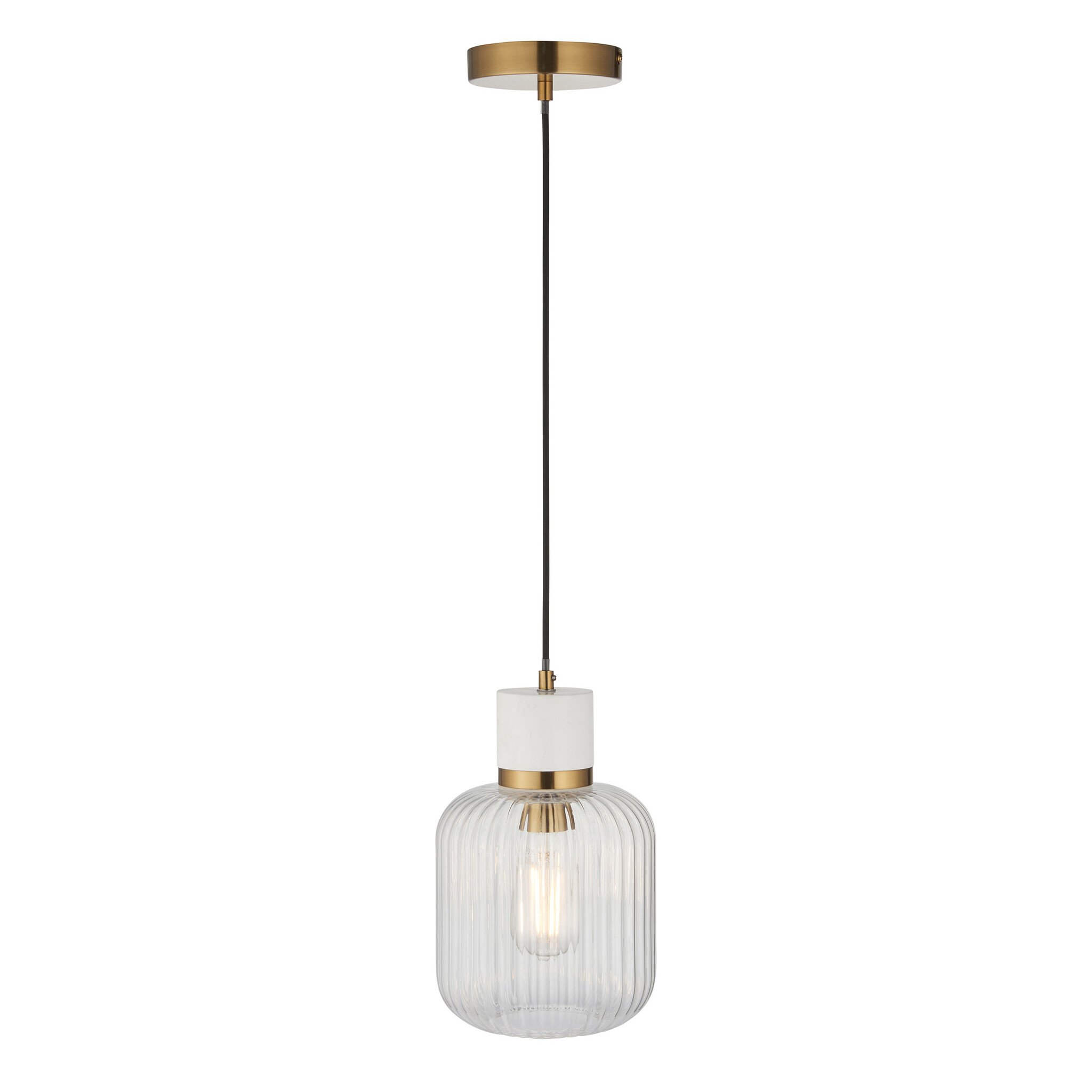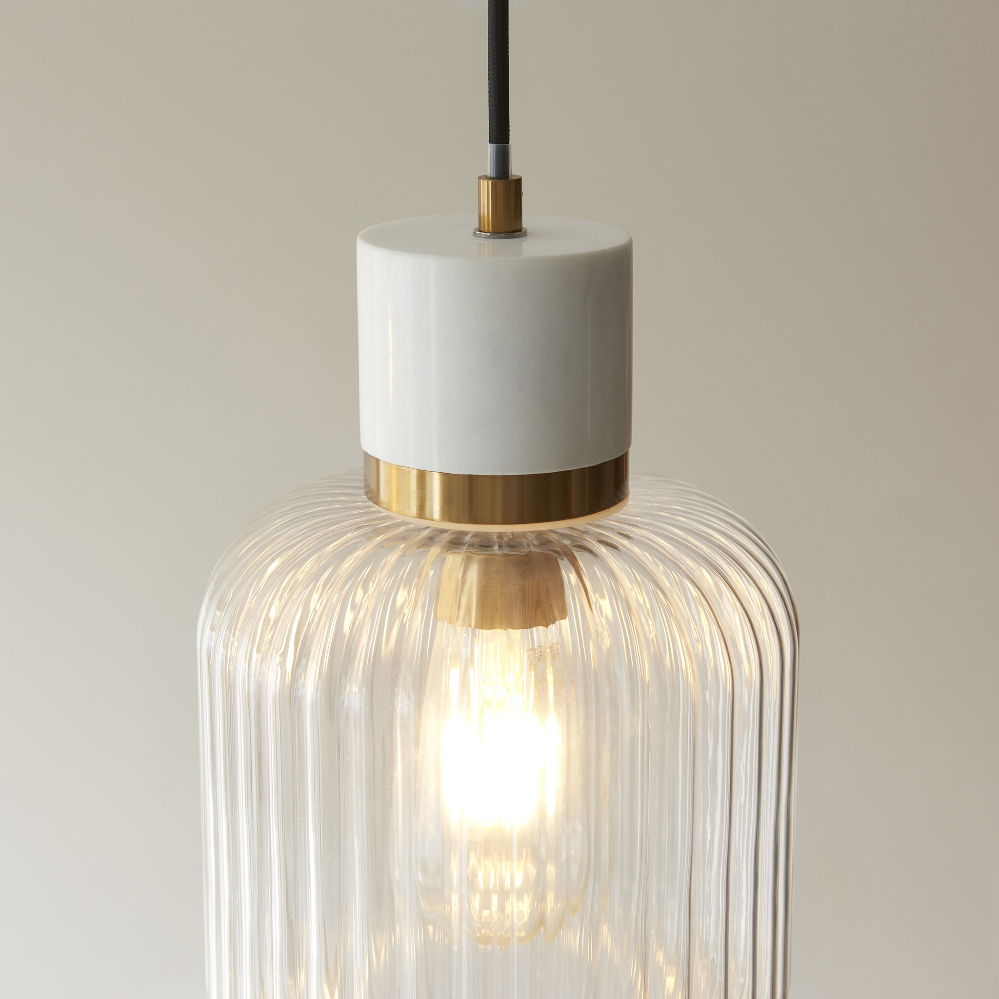 Infuse your space with contemporary sophistication using this single pendant light, crafted with rich materials and elegant form. A bold cylinder of white Volakas marble sits proudly above a brushed brass collar, suspending a softly curved clear ribbed glass shade that beautifully reveals the light source within. Finished with a coordinating brass ceiling rose and sleek black fabric flex, this pendant is perfect for adding a touch of modern luxury above kitchen islands, dining tables or in statement clusters. The contrasting tones of stone, metal and glass lend a timeless appeal with a modern edge.