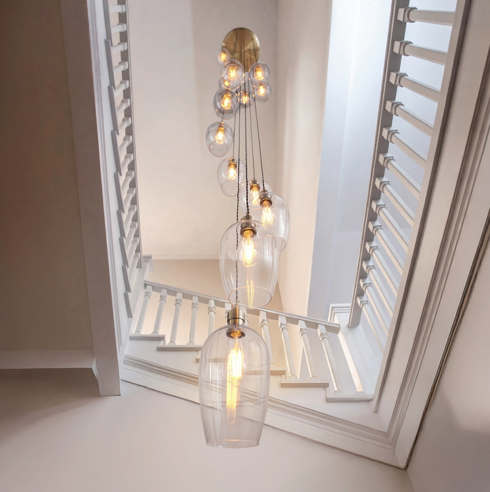 Una – Antique Brass & Clear Glass Large Stairwell Pendant Light