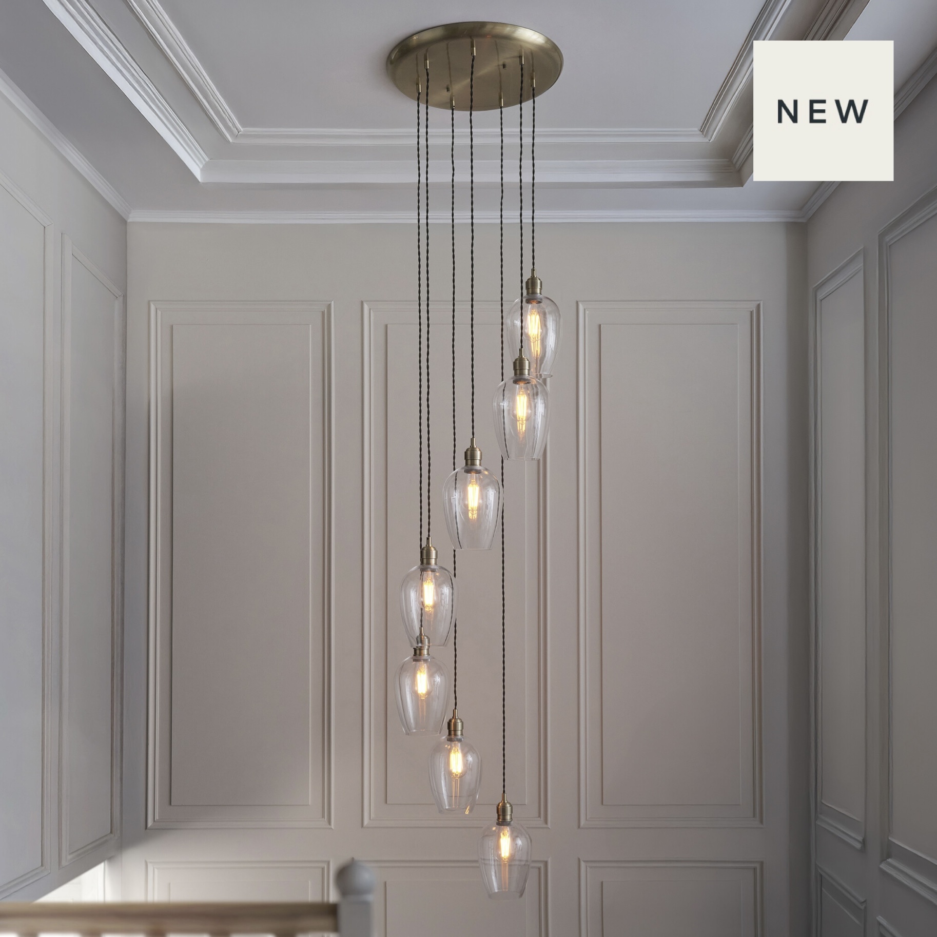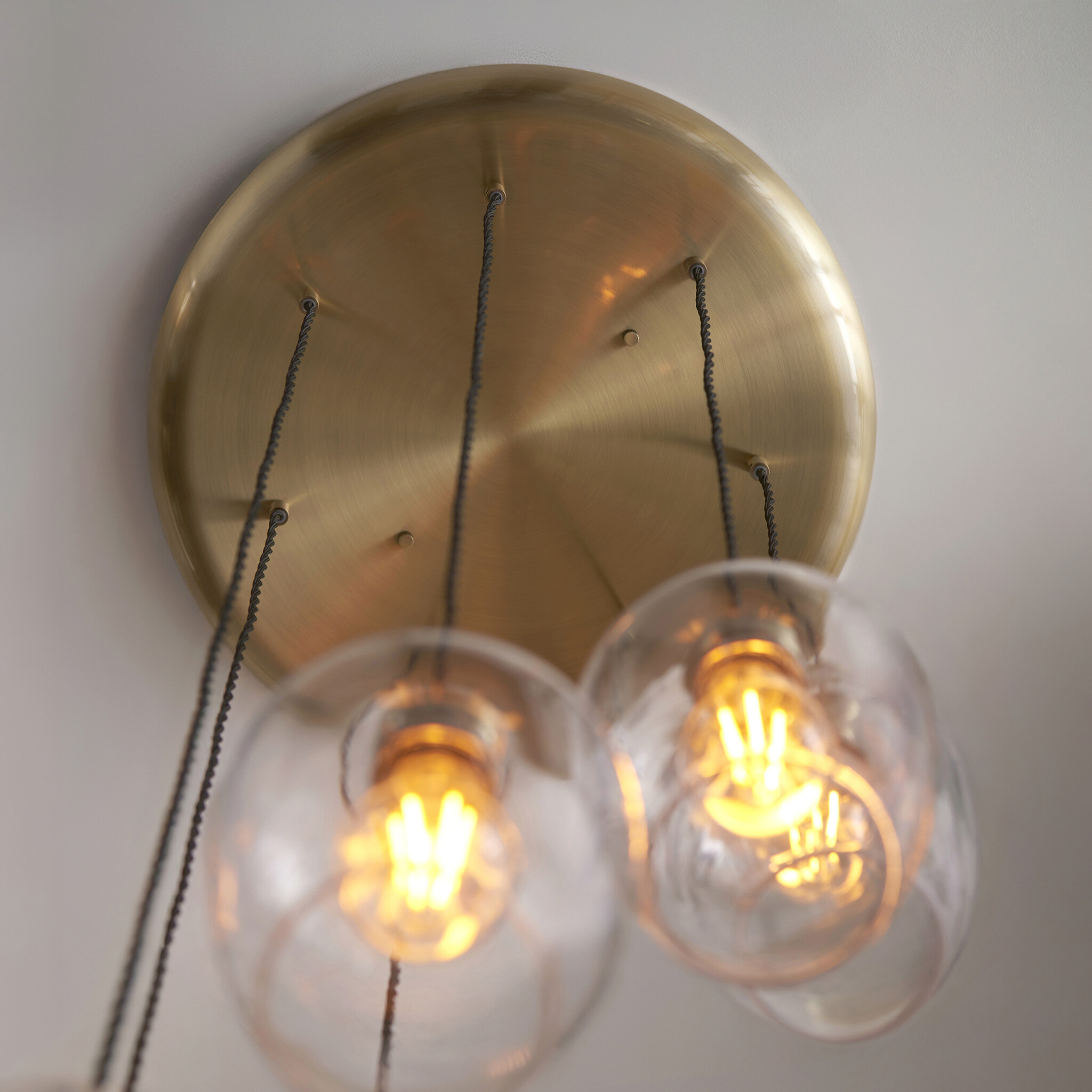Hand-crafted with high quality clear blown glass shades and antique brass plated metalwork, Una balances timeless character with contemporary style. Each glass shade showcases the beauty of the light source within, making it ideal to pair with E27 LED filament lamps for that warm, on-trend aesthetic.