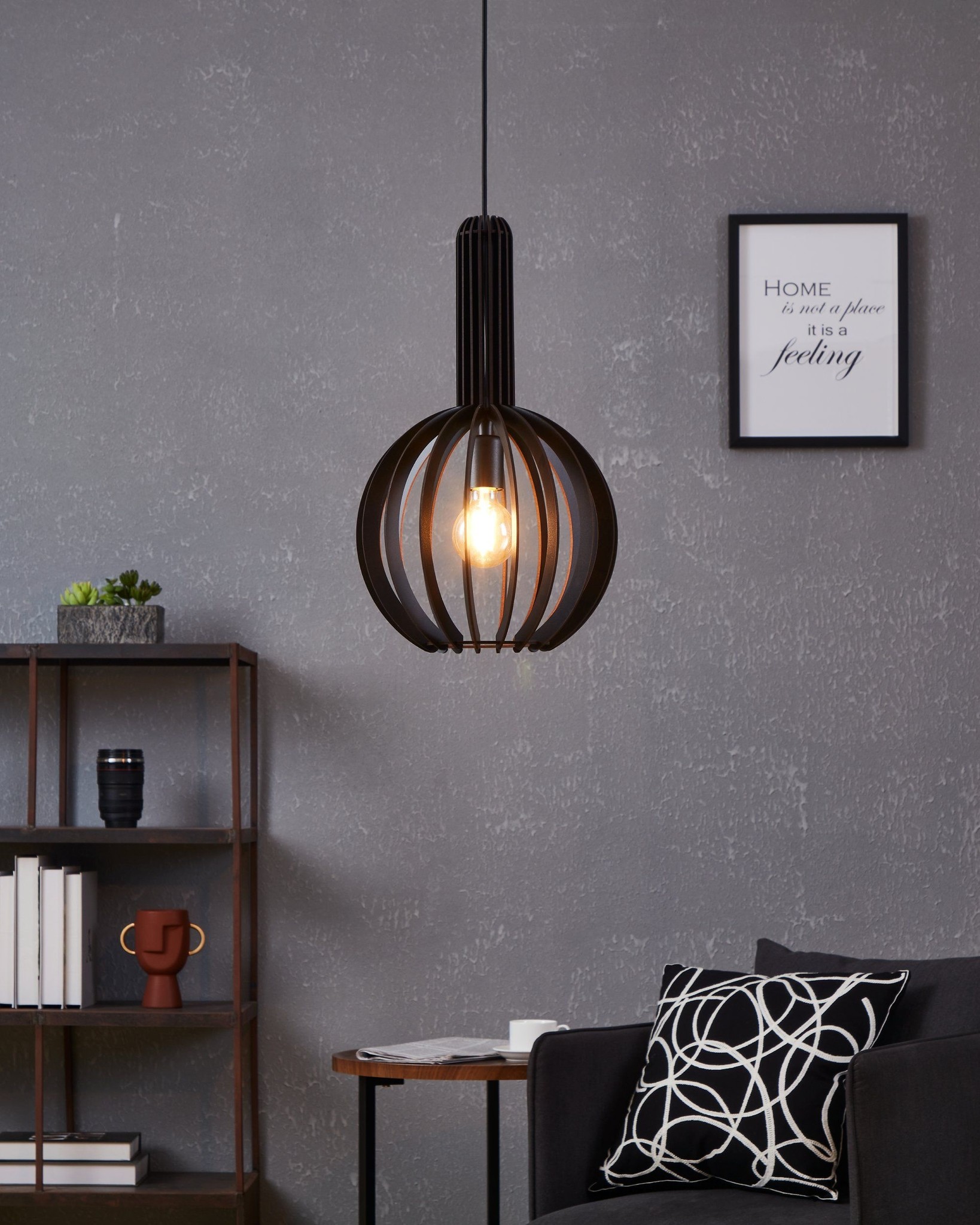 The spherical lampshade of this single pendant light is made from black wood segments, ideal against the black fabric power cables and black metal canopy. The vertical slats create a fascinating play of light in the room. A delightful pendant with a Scandi style that will fit right into your home.