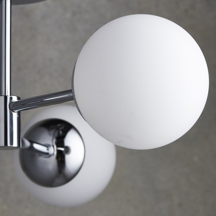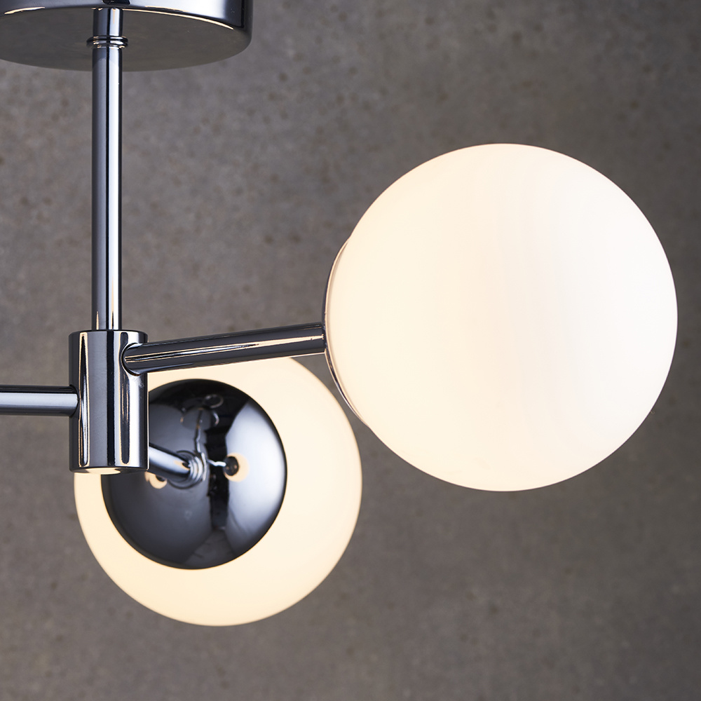 A modern sculptural ceiling light in polished chrome plating with white glass shades makes an impressive centrepiece in any modern bathroom. 3 x 6W integrated LEDs provide a sharp, crisp and even light.
